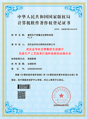 喜讯,2026年3月20日,武汉金华农生物获得国家颁发三项“先进生产工艺技术”软件著作版权保护专利证书,公司在畜禽兽药、水产渔药、饲料添加剂等板块,2026年全面提升生产工艺技术,应用先进生产技术,干扰素包膜技术,超微粉碎技术,微晶颗粒旋转技术,长效缓释技术,通过新的生产工艺和生产技术发明专利,进一步增强畜禽兽药和水产动保的疗效!打造前沿科技创新领导品牌!