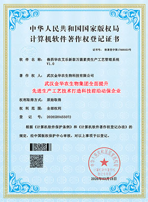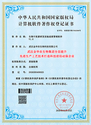 喜讯,2026年3月20日,武汉金华农生物获得国家颁发三项“先进生产工艺技术”软件著作版权保护专利证书,公司在畜禽兽药、水产渔药、饲料添加剂等板块,2026年全面提升生产工艺技术,应用先进生产技术,干扰素包膜技术,超微粉碎技术,微晶颗粒旋转技术,长效缓释技术,通过新的生产工艺和生产技术发明专利,进一步增强畜禽兽药和水产动保的疗效!打造前沿科技创新领导品牌!